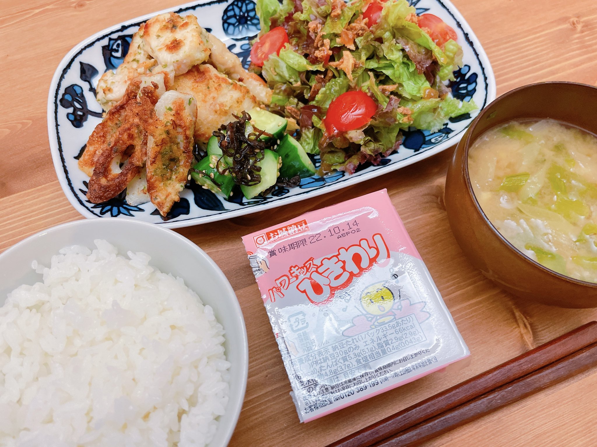 鶏ごぼう舞茸ごはん、わかめとキャベツの味噌汁、キャベツのチーズ焼き、にんにくソース和えひたし豆、小松菜と人参のツナマヨサラダ、もずく酢付き。 pic.twitter.com/hDa6gzFvn0